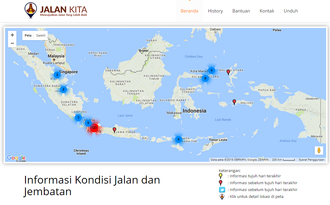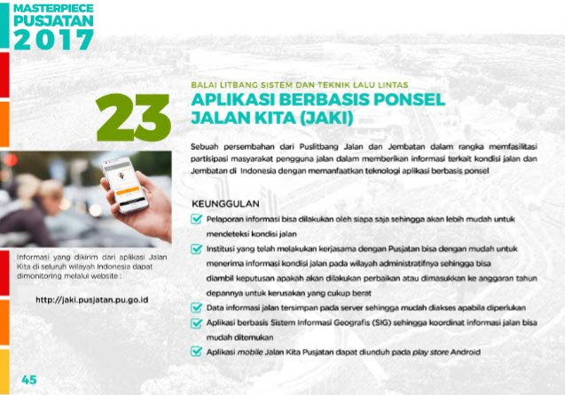 Sebuah persembahan dari Puslitbang Jalan dan Jembatan dalam rangka memfasilitasi partisipasi masyarakat pengguna jalan dalam memberikan informasi terkait kondisi jalan dan Jembatan di Indonesia dengan memanfaatkan teknologi berbasis ponsel.