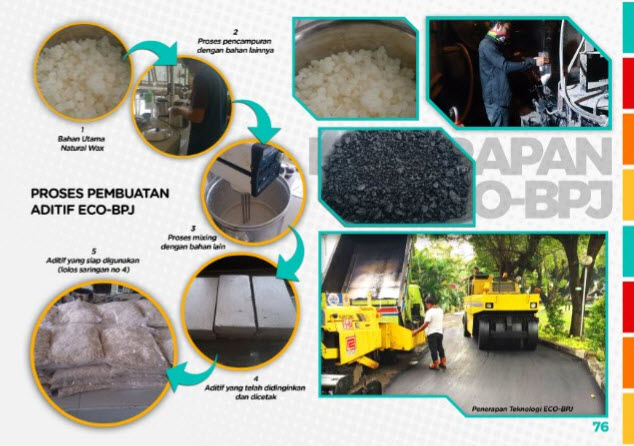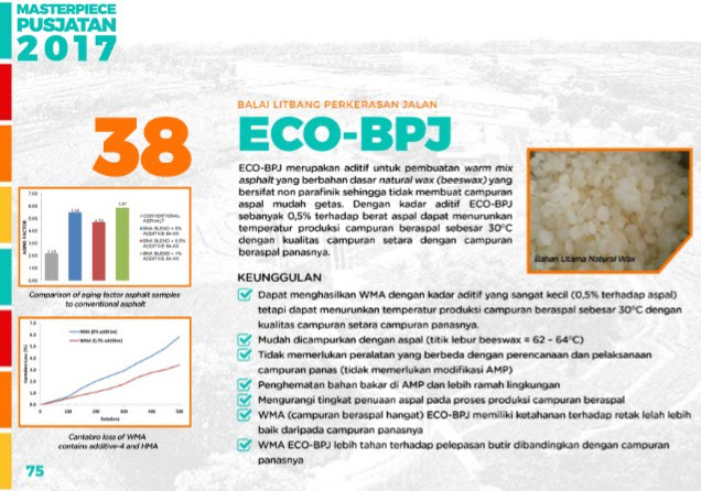 ECO-BPJ merupakan aditif untuk pembuatan warm mix asphalt yang berbahan dasar natural wax (beeswax) yang bersifat non parafinik sehingga tidak membuat campuran aspal mudah getas. Dengan kadar aditif ECO-BPJ sebanyak 0.5% terhadap berat aspal dapat menurunkan temperatur produksi campuran beraspal sebesar 30°C dengan kualitas campuran setara dengan campuran beraspal panasnya.