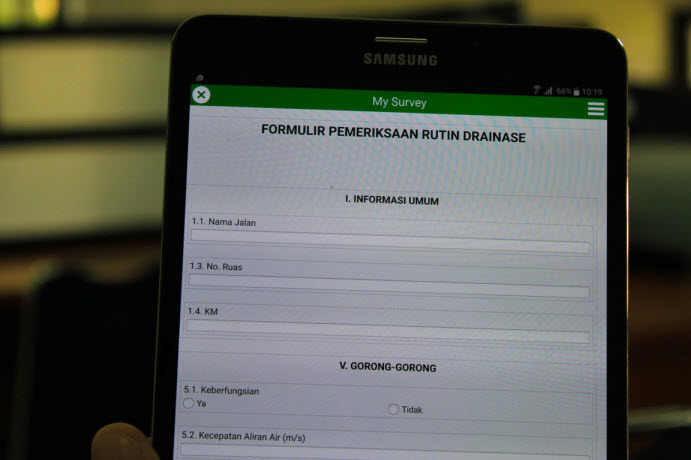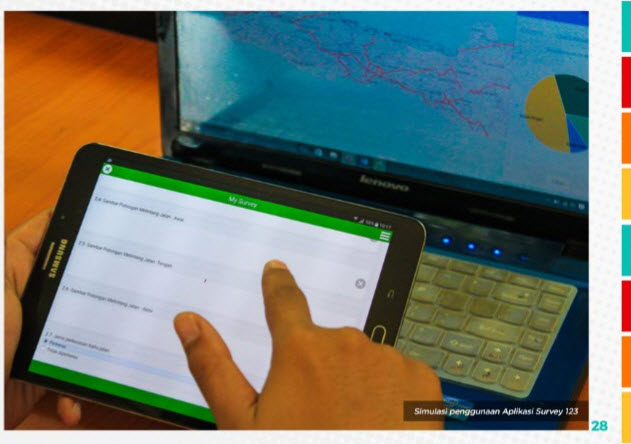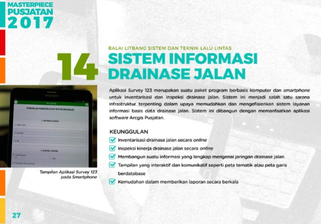 Aplikasi Survey 123 merupakan suatu paket program berbasis komputer dan smartphone untuk inventarisasi dan inspeksi drainase jalan. Sistem ini menjadi salah satu sarana infrastruktur terpenting dalam upaya memudahkan dan mengefisienkan sistem layanan informasi basis data drainase jalan. Sistem ini dibangun dengan memanfaatkan aplikasi Software Arcgis Pusjatan.
